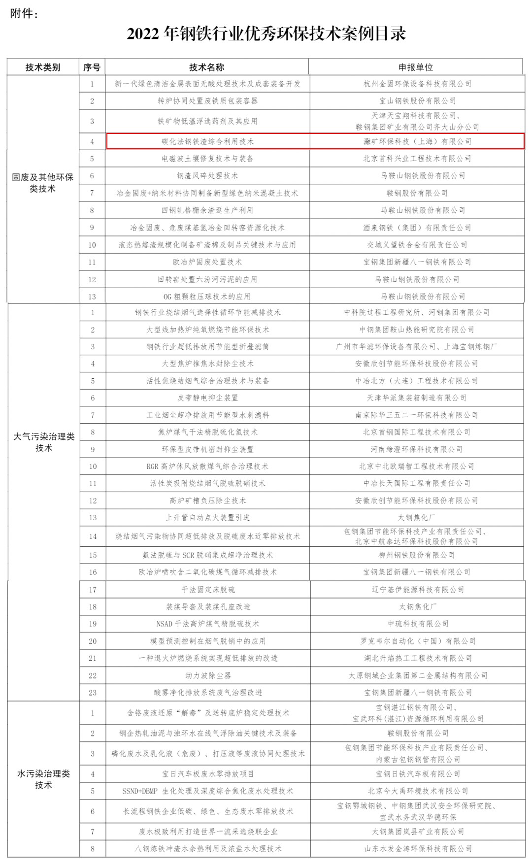 图为2022 年钢铁行业优秀环保技术案例目录